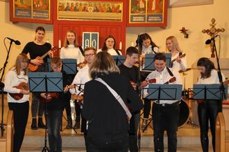 Nach dem Auftritt des Musikkurs 11 mit dem Lied „Wunder gescheh‘n“ beeindruckte besonders der Musikkurs 12 mit den Titeln „Stille Nacht, heilige Nacht“ und „Feliz Navidad“, die sie sangen und gleichzeitig selbst mit der Ukulele begleiteten, das Publikum. Nachdem mit Unterstützung der Sparkasse Unstrut-Hainich sowie dem Förderverein des Käthe-Kollwitz-Gymnasiums 30 Ukulelen gekauft werden konnten, ist das Erlernen der Ukulele ein fester Bestandteil des Musikunterrichts in der Oberstufe geworden.