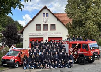 Gruppenfoto zum Jubiläum mit den Kameradinnen und Kameraden der Feuerwehr Wendehausen