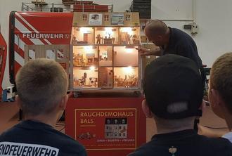 Im Anschluss an den Einsatz gab es für die Kinder und Betreuer zum Abendessen Pizza. Gestärkt konnten sie dann der Vorstellung des Rauchhauses durch den Kreisjugendwart Andreas Krüger lauschen. Nach einer kurzen Einleitung sollten die Kinder in dem Haus verschiedene Gefahren in Bezug zum Feuer finden. Zum Beispiel wurde ein Brand auf dem Herd in der Küche entdeckt.