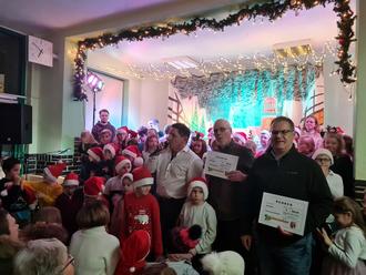 Im Anschluss an die erste Aufführung fand die Schulweihnachtsfeier statt, die vom Förderverein organisiert worden war und zu der Eltern, Großeltern, Geschwister sowie Freunde und Bekannte eingeladen waren. Auch Bürgermeister Andreas Henning ließ es sich nicht nehmen, die Aufführung zu besuchen und hatte zwei Schecks für die Fördervereine der Grund- und Regelschule über je 500 Euro aus dem Budget der Gemeinde Heyerode im Gepäck. Die Grundschule investiert das Geld in Bücher als zusätzlichen Lesestoff für die vier Klassen. Das Musical wurde am Vortag schon den Kindergartenkindern präsentiert und wird zusätzlich in den Seniorenheimen Heyerode und Diedorf zur Aufführung kommen.