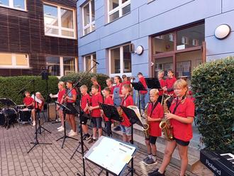 Als die ersten Töne des Bläserorchesters der Klasse 6b erklangen, sammelten sich unserer neuen Fünftklässler und Fünftklässlerinnen geschwind vor der Bühne, wo sie vom Schulleiter, Herr Hartleb, freundlich begrüßt wurden.