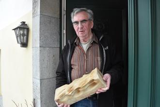 Alois Gries mit einem kunstvollen Schleifstein als Relikt der Zigarrenherstellung in Heyerode.