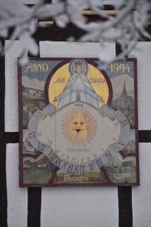 Die gewissermaßen in ein Gemälde verpackte Sonnenuhr schuf im Jahr 1994 der Kirchenmaler und Restaurator Peter-Raphael Richwien. Über dem strahlenden Sonnengesicht thront die Schutzpatronin Maria, während rundherum die Sehenswürdigkeiten des Dorfes im Südeichsfeld grüßen: die Pfarrkirche „Mariä Geburt“, das St.-Josefs-Heim, das Pfarrhaus, das St.-Elisabeth-Krankenhaus, das Schloss Bischofstein, die evangelische Kirche, das Rathaus sowie der Eisenbahnviadukt. Der Lengenfelder Künstler hat sein Werk inzwischen restauriert, so dass es auch in seiner nunmehr 30. Saison strahlen kann.