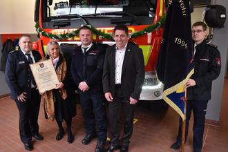 Dieser feierlichen Premiere schloss sich ein weiterer Höhepunkt an, als Margarete Krumbein zur Schirmherrin der Fest- und Jubiläumsveranstaltung „100 Jahre Freiwillige Feuerwehr Heyerode“ ernannt wurde. In Würdigung der Verdienste um das örtliche Löschwesen und in Anerkennung ihres langjährigen gesellschaftlichen Engagements der Förderung des Brandschutzes in ihrem Heimatort überreichten ihr Vereinschef Lars Marx, Bürgermeister Andreas Henning und Wehrleiter Jens Henning die Ehrenurkunde. „Das ehrt mich sehr und ich werde die Feuerwehr weiter unterstützen“, sagte die sichtlich gerührte Margarete Krumbein, die sich nun richtig in Heyerode angekommen fühle.