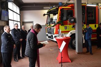 Pfarrer Frank Hundeshagen während der kurzen Segensandacht für die beiden neuen Feuerwehrautos.