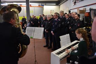 Helene Stephan am Piano und Marco Marx begleiten musikalisch die Fahrzeugweihe.