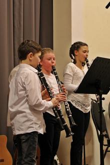 Eröffnet wurde der Abend von den verschiedenen Instrumentalgruppen der Bläserklasse 5b, die ihre im Musikunterricht erarbeiteten Stücke zum ersten Mal auf einer großen Bühne präsentierten. Etwas aufgeregt, aber voller Stolz, zeigten sie dem Publikum, was sie seit September auf ihren Instrumenten gelernt hatten.