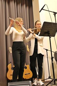 Die Instrumentalisten des Abends faszinierten das Publikum mit ihren beeindruckenden Darbietungen. Emil Hilpert aus der 7b entlockte seiner Posaune mit „Allegretto grazioso“ zauberhafte Melodien, während Clara Petri aus der 9b mit ihrer Querflöte eine emotionale Interpretation von „River flows in you“ präsentierte. Ein besonderes Highlight war der Auftritt von Hannah Müller, Pauline Richardt, Emilia Adler und Klara Hartleib aus der 10b, die mit Klarinette, Querflöte und Saxophon eine mitreißende Version von „Humpa Humpa“ der Fäaschtbänkler zum Besten gaben.