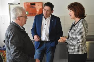 Helmuth Zengerling (links) erläutert Andreas Henning von der Landgemeinde Südeichsfeld und Staatssekretärin Katja Böhler die anstehenden Arbeiten in der Küche der Festhalle Wendehausen.