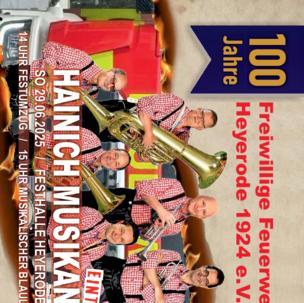 | • | 29. Juni 2025: Großer Festumzug mit Heyeröder Vereinen und eingeladenen Feuerwehren aus der Region. Im Anschluss lädt der Feuerwehrverein zu einem musikalischen Feuerwehrnachmittag, mit den Hainich Musikanten, in den Heyeröder Hafen ein. Der Eintritt ist frei! |