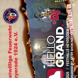 | 28. Juni 2025: Jubiläumsabend „100 Jahre Freiwillige Feuerwehr Heyerode“ im Heyeröder Hafen. Musikalisch begleitet von der Band „Hello Grand“ aus dem Eichsfeld. Der Eintritt ist frei! Im Anschluss an den Abend findet eine After Show -Party mit DJ statt. |