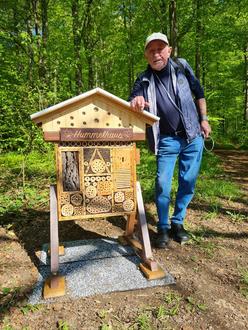 Schön länger plante der engagierte Naturfreund, ein Insektenhotel zu basteln, um auch etwas für den Erhalt dieser Tiere zu tun. Aufgrund seiner Krankheit verzögerte sich die Fertigstellung. Die Arbeit am Projekt war für ihn Abwechslung und Balsam für die Seele. "Ohne die Hilfe weiterer Naturliebhaber hätte es nicht zu Ende geführt werden können", erklärt er und zeigt sich erfreut, dass sein "Hummelhaus" von Bienen und anderen Insekten gut angenommen wird.