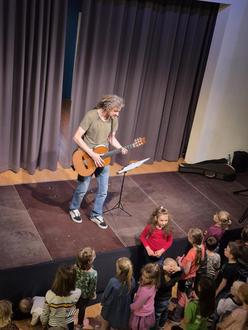 Nach einer kurzen Pause kamen dann die Erwachsenen auf ihre Kosten. Mago Masin ist ein Unikat in der deutschsprachigen Kleinkunstszene. Ein Mann, lange Rastalocken, eine Gitarre und viele skurrile Gedankengänge. Zunächst überprüfte er das Niveau der Gäste mit seinem Song von den deutschen Landeshauptstädten. Dann verriet er, dass er Wolfgang heißt und auch schon eine Lesebrille benötigt, aber die Altersweitsicht hat. Dann durften Gäste der ersten Reihe auf die Bühne und einen gesungenen Sketch als Liebespärchen in einem Zugabteil gemeinsam mit ihm und einem Schaffner spielen!