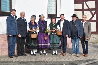Ein Damen-Trio in Hallunger Tracht wird von den Ehrengästen flankiert.