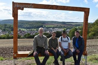 Im „Heyeröder Fenster“ entlang des neuen TOP-Wanderweges haben Uwe Müller und Claudia Wilhelm von der Naturparkverwaltung, Helmut Stützer als Hauptinitiator des Projektes sowie Bürgermeister Andreas Henning Platz genommen.