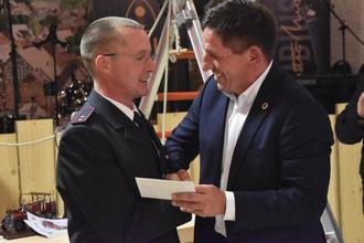 Wehrführer Michael Montag wird von Bürgermeister Andreas Henning ausgezeichnet.