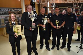 Sarah Montag und Markus Montag von der Feuerwehr Wendehausen sowie Falko Hey, Erik Kieser und Henrik Manegold von der Feuerwehr Felchta (von links) freuen sich über die errungenen Kreispokale.