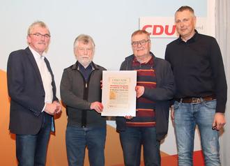 Heeringsessen-CDU-01-03-23-bo-6: Gerhard Koepke, Josef Kolling, Bernd Kuhn (alle: Christliche Hospizhilfe im Landkreis St. Wendel e.V.) erhalten von Andreas Leyerle, Vorsitzender des CDU-Ortsverbandes St. Wendel, die Wendelinusplakette.
