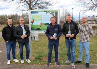 Foto: Bürgermeister Peter Klär (Mitte), Ortsvorsteher Andreas Leyerle (2.v.r.) und Tim Recktenwald (r.) vom Umweltamt der Kreisstadt St. Wendel haben zusammen mit dem Vorsitzenden der KuLaNi, Thomas Gebel (2.v.l.), und Regionalmanager der KuLaNi, Christian Schaadt (l.), den neuen Tiererlebnispfad am Wendelinuspark offiziell eröffnet.
