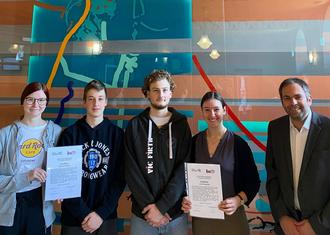 v.l.n.r.: Hannah Becker, Jakob Zimmermann, Kilian Ridschy, Lara Wengerek, Schulleiter Wendalinum: Alexander Besch