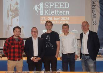 St. Wendels Bürgermeister Peter Klär stellte während einer Pressekonferenz am 20. Mai gemeinsam mit Boris Röder, Leiter Unternehmenskommunikation Ursapharm Arzneimittel (rechts), Lukas Mai, Projektmanager ArtRock (Mitte), Michael Schultheis, Mitinitiator des Events (Zweiter von links) und Lukas Kraushaar, Landestrainer Sportklettern & Vorsitzender Generation Rocklands (links), das neue Event "Speedklettern in der City" vor. Fotograf: Kreisstadt St. Wendel / Josef Bonenberger