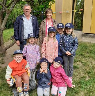 Patricia Rammacher (Leiterin der Kita), Roland Müller (SSW), Kinder der Kita Winterbach