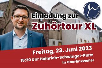 Die Zuhörtour XL unseres Fraktionsvorsitzenden und Bürgermeisterkandidaten Marc André Müller kommt am Freitag, 23.06.2023 nach Oberlinxweiler. Ab 17 Uhr wird Marc André Müller zu Haustürbesuchen im Ort unterwegs sein, denn er hat es sich zum Ziel gesetzt, sich bis zu den Sommerferien in mindestens 1.000 St. Wendeler Haushalten persönlich vorzustellen. Ab 18:30 Uhr steht er dann mit Mandatsträgern aus dem Ortsrat und dem Stadtrat auf dem Heinrich-Schwingel-Platz an der Kulturscheune, um mit den Bürgerinnen und Bürgern ins Gespräch zu kommen.