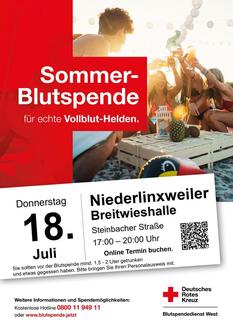 Am Donnerstag, 18.07.2024 von 17.00 – 20.00 Uhr beim DRK Ortsverein Niederlinxweiler in der Breitwieshalle.