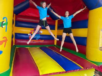 Lisa Kubik(r.) und Frida Zimmer (l.) beim Funktionstest einer Station des Kinder-Schwimmfestes