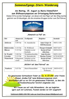 Auch in diesem Jahr führt die Pfarreiengemeinschaft St. Wendel am Fest Maria Himmelfahrt ihre jährliche Sternwanderung zur Straße der Skulpturen am Ortseingang von Baltersweiler durch. Der 15. August ist heuer ein Montag und im Saarland ein Feiertag. Von sieben Kirchen aus machen sich die Pilger ganz früh am Morgen in geführten Gruppen zu Fuß auf den Weg: St. Anna und St. Wendel in St. Wendel (5 Uhr), St. Remigius in Bliesen, Hl. Familie in Winterbach, St. Willibrord in Baltersweiler und St. Marien in Urweiler (5.15 Uhr). Nur die Pilger aus St. Mariä Himmelfahrt in Namborn kommen der Entfernung wegen ab 5.45 Uhr mit dem Fahrrad.