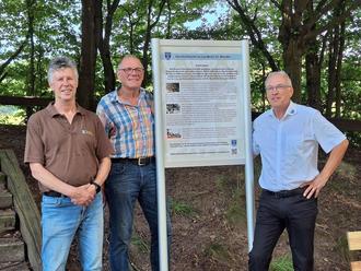Rainer Hopf, Vorsitzender des Dörrenbacher Heimatbunds, Dieter Bleimehl, Ortsvorsteher von Dörrenbach, und Landrat Udo Recktenwald bei der Einweihung der Infotafel.