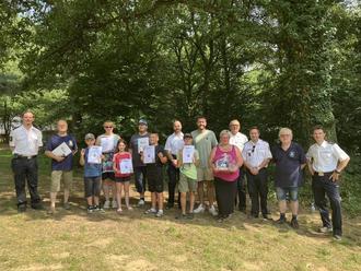 Im Anschluss an einen Freibadbesuch fand am Freitag (15.08.2025) der offizielle Teil des Zeltlagers statt. Nach Worten von Stadtjugendbeauftragtem Klaus Kirchen, Funktionsbeigeordnetem Alexander Zeyer, der Wehrführung, Kreisjugendbeauftragtem Christopher Mascioni sowie dem Kreisfeuerwehrverband wurde Sabrina Theobald, John Theobald und Rolf Gerhardt die silberne Ehrennadel der Jugendfeuerwehr verliehen. Zusätzlich wurde 5 Kindern das Kinderflämmchen überreicht. Angelika Lehnhardt wurde für ihr Engagement in der Stadtjugendfeuerwehr ebenfalls geehrt.