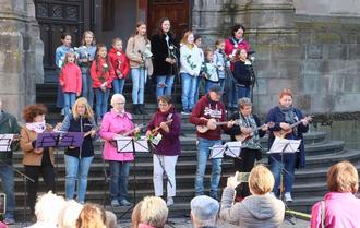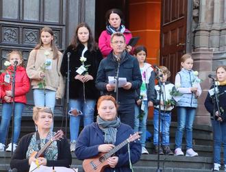 Im Anschluss an ein ökumenisches Friedensgebet gestalteten der Jugendchor der Evangelischen Kirchengemeinde gemeinsam mit dem Ukulelen-Stammtisch der Fun Music School und dem Gesangsduo Anton Konochenko und Katerina Mizina aus der Ukraine das musikalische Programm passend zur Friedensthematik. Den Abschluss bildete das europaweite Glockenläuten für den Frieden.
