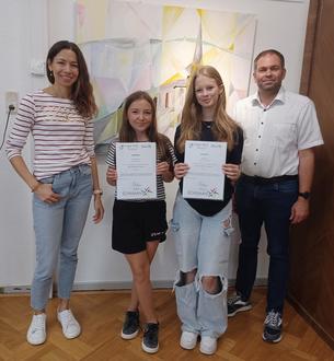 Foto v. l.: Lehrerin Anna Engel, Lana Schreier, Sophie Kern, Schulleiter Alexander Besch