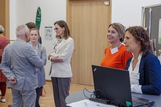 Jede Rubrik ist farblich gekennzeichnet, diese Farben finden sich auch an den jeweiligen Stehtischen wieder. Dadurch können sich die Besucher schnell und zielgerichtet über die Themen informieren, die sie besonders interessieren.
