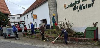 Im Oktober hat die IG Dorfwerkstatt Hoof die beiden Ensembles "Der Gießer" in der Leitersweiler Straße oberhalb der Prot. Kirche und "Schummi" (PKW an Hauswand) in der Neuen Straße gepflegt.