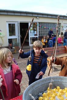 Gegen 11.00 Uhr, am 08.11.2022 wurde die Kinderkirmes auf dem Außengelände der Kita mit passender Musik eröffnet. Dort konnten die kleinen Kirmesbesucher schon die verschiedenen Spielstationen sehen und warteten aufgeregt auf die Verteilung der Laufkarten. Die Spielstationen wurden von den Erzieherinnen der Kita betrieben und gleich nach der Eröffnung wurden diese von den Kindern freudig ausprobiert. Zu den bereitgestellten Angeboten gehörten Enten-Angeln, Kronkorkenweitwurf und ein Tischfußball. Für das leibliche Wohl der Kinder wurde auch gesorgt, es gab einen Crêpestand, eine Popcornstation und ein Rostwürstchenstand.