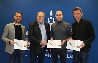 (von links nach rechts): Marcus Reister (Firmengruppe Wolf & Sofsky), Rainer Martin (artec Bauprojekte), Philip Martin (artec Bauprojekte) und St. Wendels Bürgermeister Peter Klär bei der Unterzeichnung des städtebaulichen Vertrages für das St. Wendeler Neubaugebiet „Lanzenberg“.