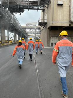 Am Eingangstor begrüßte uns Gilles Huff als Vertreter der AG der Dillinger Hüttenwerke. Herr Huff geleitete uns in einen Präsentationsraum, wo er von Dipl. Ing. Manfred Engel (i. R.) abgelöst wurde, der die Führung nun übernahm und uns zunächst die theoretischen Grundlagen der Stahlproduktion erklärte. Nach der kurzen Präsentation wurden wir mit feuerfesten Schutzjacken, Schutzhelmen mit Sicherheitsbrillen und Kopfhörern ausgestattet. Nun ging es los! Ein Kleinbus stand für uns schon bereit und die Werksbesichtigung begann. Erste Station war der Hochofen, wo die übrigen Kohlereste vom flüssigen Eisen getrennt und zum Weitertransport in riesige Güterwaggons in Torpedoform gefüllt wurden. Anschließend fuhren wir zum hütteneigenen Hafendock. Das Bild war geprägt von riesigen Förderbändern und speziellen Schaufeln, die eigens zum Entladen von Schiffen hergestellt werden. Danach ging es weiter zur Kokerei, wo durch das Entgasen der Kohle ein poriger Koks, der im Wesentlichen Kohlenstoff enthält, weiterverarbeitet wird, und schließlich zum Stahlwerk. Dort wird das flüssige Eisen von allen unerwünschten Bestandteilen gereinigt und in riesige „Barren“ bzw. „Riegel“ gegossen. Diese Riegel werden an der letzten Station unserer Führung verarbeitet: im Walzwerk. Hier werden die fertigen Riegel in einer Art riesigen „Mikrowelle“ wieder erhitzt und auf Transportrollen zu Walzen weitergeleitet. Mit diesen 110 cm hohen Walzen werden die Riegel dann schließlich in die gewünschte Form und Größe gewalzt. Am Ende werden mit riesigen Scheren dann noch die ungleichmäßigen Ränder abgeschnitten. Ein Schüler unseres Kurses, Philipp Vogt, zog begeistert Bilanz von unserem Besuch: „Ich bin überwältigt von dem riesigen Werk und beeindruckt von der anspruchsvollen Arbeit, die die Mitarbeiter hier verrichten.“ Nachdem wir am Ende unserer aufschlussreichen Rundführung die Schutzkleidung abgelegt hatten, bedankten wir uns herzlich bei Manfred Engel für die spannende Werksbesichtigung. Abgerundet wurde die schöne Exkursion mit einem kleinen Imbiss in Lebach.