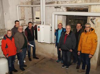 St. Wendels Bürgermeister Peter Klär (Vierter von links) und Dörrenbachs Ortsvorsteher Dieter Bleimehl (Vierter von rechts) beim Anschluss des Dorfgemeinschaftshauses Dörrenbach ans Nahwärmenetz der Energiegenossenschaft Fürth/Dörrenbach.