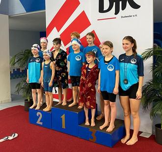 Mit zwei starken Mannschaftsauftritten warteten die Heuler bei den beiden ersten Wettkämpfen des Jahres 2025 auf. Bereits am 26.01. waren die Heuler mit 15 (!) StarterInnen beim DUKI-Cup der DJK Dudweiler am Start. Bei diesem Wettkampf, der sich an die jüngeren SchwimmerInnen richtet, konnten die Nachwuchstalente der Heuler ihre ersten Wettkampfsporen verdienen. Behutsam aufgebaut durch das Team um Chef-Coach Ingo Kubik zeigten alle StarterInnen einen tollen Auftritt mit vielen neuen Bestzeiten und einer Menge an Medaillen. Das Foto zeigt die jüngsten StarterInnen um Co-Trainerin Lisa Kubik.