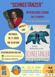 Die renommierte Autorin Antje Babendererde ist am 19.11.25 in der Stadtbibliothek Kölleda zu Gast und liest aus ihrem eindrucksvollen Jugendroman „Schneetänzer“.