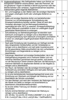 | 6. | Sofern eine Aufstallung nicht realisierbar ist, sollte zumindest die Fütterung nicht im Freien erfolgen, sondern in den Stall verlegt werden. (keine Anlockung von Wildvögeln) | |