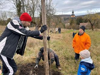 Vor 2 Jahren hat der Heimatverein die Aktion ins Leben gerufen, für jedes Neugeborene im Ort einen Baum zu pflanzen. Mit Unterstützung durch den Obsthof Großmonra, der auf dem Anger die Streuobstwiese pflegt und bearbeitet, wurden dort diese Obstbäume gepflanzt.