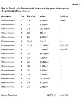 | 1. | Die Aufstellung eines vorhabenbezogenen Bebauungsplanes „Bürgersolarpark Kleinneuhausen“. Der räumliche Geltungsbereich des Bebauungsplanes ist in der Anlage 1 dargestellt. Die betroffenen Flurstücke sind der Anlage 2 zu entnehmen. |