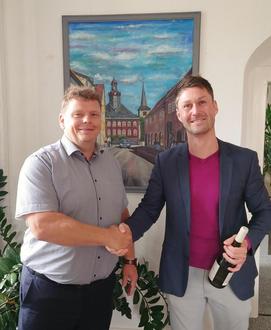 Sebastian Goldhorn, Gemeinschaftsvorsitzender der VG Kölleda, ließ es sich nicht nehmen den neuen hauptamtlichen Kölledaer Bürgermeister Uwe Kraneis im Amt zu begrüßen. Als kleinen Willkommensgruß gab es eine Flasche Wein vom Weimarer Poetenberg.