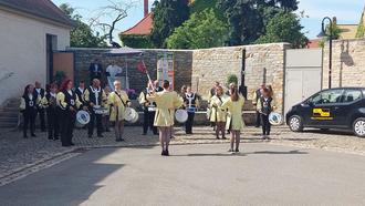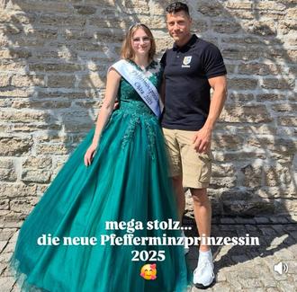 Der Markt am Samstag wurde durch den Fanfarenzug Kölleda musikalisch eröffnet und dann übernahm Bürgermeister, Uwe Kraneis, das Wort. Er dankte allen Beteiligten und aktiven Mitgliedern des HGV für die Unterstützung bei der Vorbereitung und Durchführung des Festes. Vor allem aber auch den vielen Sponsoren ohne die die Durchführung des Wippertusfestes in dem Maße gar nicht möglich gewesen wäre. Ein besonderes Highlight waren die ehemaligen Prinzessinnen die von Familie Schöps im Vorfeld eingeladen worden sind. Die Besucher staunten über die zahlreichen ehemaligen Hoheiten auf der Bühne. Unsere Pfefferminzprinzessin, Franziska I, hatte auch wieder viele Hoheiten aus der Region geladen. Sehr emotional trug sie ihre Abschiedsrede vor und dankte ihren zahlreichen Unterstützern und Weggefährten. Zu denen sie in der Zwischenzeit tiefe Freundschaften pflegt. Der Höhepunkt war die Krönung der neuen Pfefferminzprinzessin. Endlich wurde das gut gehütete Geheimnis gelüftet und Chira I. schritt durch den Hof zur Bühne. Carolin Schöps, die Vorgängerin von Franziska I. krönte zuerst die amtierende Prinzessin ab. Franziska I. übergab ihr Zepter an die neue Prinzessin, legte ihr die Schärpe um und setzte ihr die Krone auf.