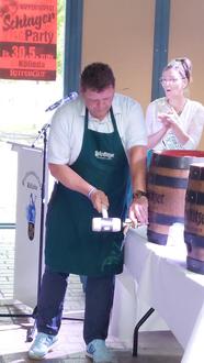 Souverän meisterte Bürgermeister, Uwe Kraneis, den Fassbieranstich und viele Besucher konnten das Freibier genießen. Nach dem öffentlichen Teil startete die Ü30 Party im Rittergut. Gegen 22 Uhr wurde für die angekündigte Lasershow die Party unterbrochen. Erwartungsvoll hatten sich sehr viele Gäste im Hof eingefunden. Die Firma MSK aus Wettin bekannt für Feuerwerke und Spezialeffekte hat uns wieder eine tolle Lasershow mitgebracht. Mit passender Musik hinterlegt verzauberte das Team um Mark Schmidt das begeisterte Publikum. Der Abschluss der Lasershow wurden noch mit Spezialeffekten durch Pyrotechnik gekrönt. Die Besucher klatschten und jubelten. Später konnte noch zur Partymusik weitergetanzt werden. Zum Männertag gab es Rummel für die ganze Familie auf dem Markt und gastronomische Versorgung. Das Angebot wurde rege genutzt.