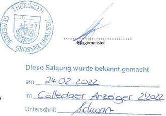 Aufgrund des § 19 Abs. 1 der Thüringer Kommunalordnung (ThürKO) in der Fassung der Neubekanntmachung vom 28. Januar 2003 (GVBl. S. 41), in der jeweils gültigen Fassung, und des § 49 des Thüringer Straßengesetzes (ThürStrG) vom 07. Mai 1993 (GVBl. S. 273) in der Fassung vom 23. September 2003 (GVBl. S. 433), in der jeweils gültigen Fassung hat der Gemeinderat der Gemeinde Großneuhausen in seiner Sitzung am 09.12.2021 folgende Satzung über die Straßenreinigung (Straßenreinigungssatzung) im Gebiet der Gemeinde Großneuhausen beschlossen:
