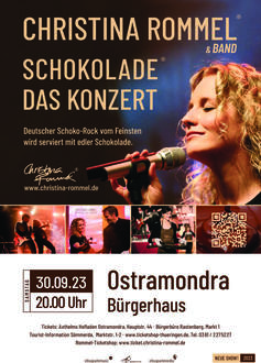 New York. Paris. Ostramondra. Christina Rommel ist eine der derzeit erfolgreichsten Live-Musikerinnen der deutschen Rock-Szene und berühmt für ihre legendären Schokoladenkonzerte. Mit ihrem international einzigartigen Show-Konzept gastiert die Sängerin - mit Chocolatier und Band - am 30.09.2023 im Bürgerhaus Ostramondra.